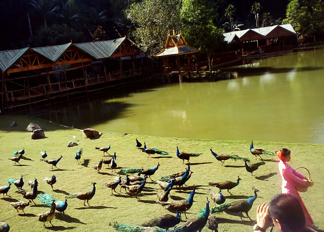 园内按四星级标准修建的孔雀山庄,以休闲度假中心形式设计建设,展现雨林怀抱中的绿色生活。山庄拥有客房51套,其中标准间45间,套房6间。水上餐厅能容纳200人同时进餐,可提供各类民族特色菜品和独具风情的傣家长桌宴。山庄内设有两间中型多功能会议厅,设有专业中控设备和音响设备,能够提供各种多媒体服务。
