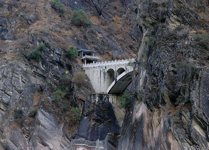 虎跳峡其实有一条半路,一条路是指连接白水台和桥头的公路,越野吉普车可以勉强通过,在夏秋两季经常塌方,另外的半条路是因为它的起点其实在中虎跳中峡旅馆附近分出的叉路,向上爬升垂直高度约200米后与公路平行,终点在桥头,中间经过“本地湾”和“28道拐”。