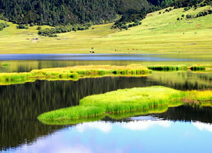 藏语“碧塔”是栎树成片的地方。藏语中碧塔海又意为宁静的海。在晴朗的日子里观赏春天的碧塔海,别有情致。湖畔四周,苍松古栎,遮天蔽日,碧塔海被黛色的群山环抱,像一颗镶嵌在群山中的绿宝石。湖水清澈明亮,在太阳缕缕金辉照耀下,闪闪熠熠,奇秀悦目。高山临湖,山光水色融为一体,真可谓“半湖青山半湖水”。湖周围杜鹃花绚丽灿烂,湖畔鸟语花香,游鱼游曳于浅滩岸边。从杜鹃花海中向外望去,在广阔的草甸上,成群的牛羊悠然徜徉于鲜花点缀的草甸上,湖光与草原由此相映成趣。