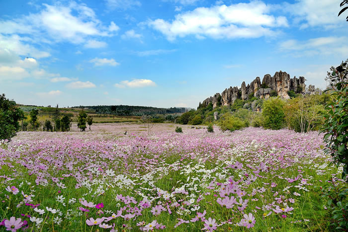 云南石林世界地质公园位于云南省昆明市石林彝族自治县境内,占地总面积400平方公里,海拔1500米—1900米之间,距省会昆明78千米,素有“天下第一奇观”“石林博物馆”的美誉,有现代肖草《重上石林》诗:“挥剑指天穹,坐骑舞亘龙。欲跃蓬阁上?何景不尽穷。”对石林景观做了较为生动、形象的描述。诗中不仅赞美石林地质公园拥有世界喀斯特地貌的精华,被誉为“天下第一奇观。以石成林,形态各异,有仿佛擎天石柱,似乎神圣挥剑直指苍穹;有透迤群山的一丛丛峰林,好似正在舞动的一条亘龙;有参差的峰峦,又如仙人在蓬莱仙岛聚会,各种风景尽收眼底,美不胜收。也是首批中国国家重点风景名胜区、中国国家地质公园、世界地质公园,与北京故宫、西安兵马俑、桂林山水齐名,成为中国四大旅游胜地之一。
