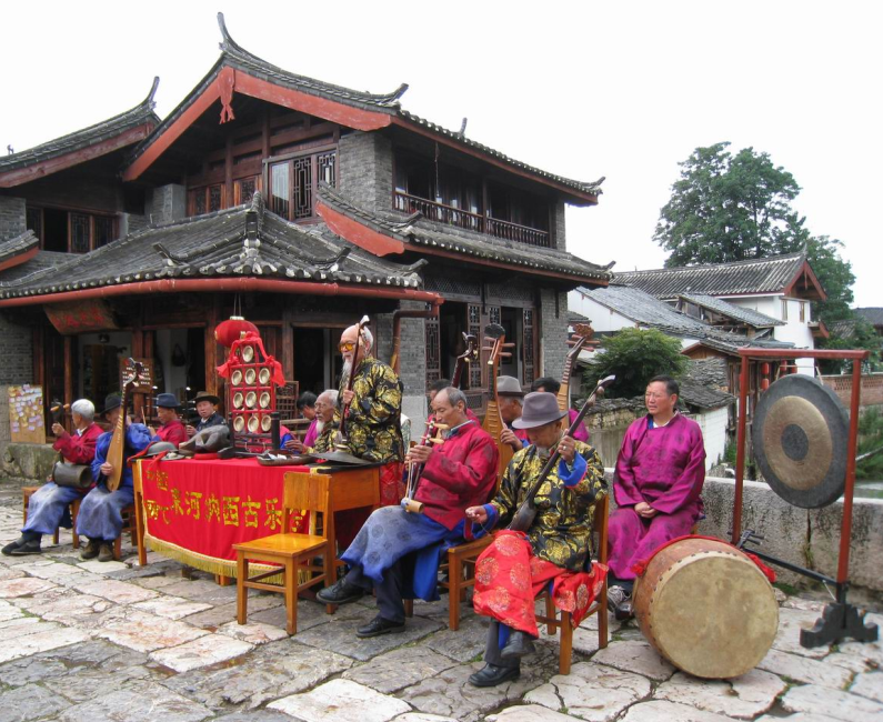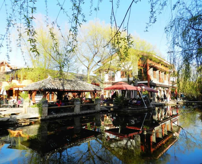从丽江古城往北,沿中济海东侧的大路行约四公里,便见两边山脚下一片密集的村落,这就是被称为清泉之乡的束河古镇。当年徐霞客游芝山解脱林时,曾走过此道,在他的记述中这样写道:“过一枯涧石桥,西瞻中海,柳暗波萦,有大聚落临其上,是为十和院。”“十和”即今束河古镇之古称。历史开通于唐代的茶马古道,从滇南经丽江直达西藏拉萨,经唐、宋、元、明、清千余年的运营发展,促进了沿线各族人民的经济文化交流,束河即是丽江坝子中保存完好的驿站,1997年被列为“世界文化遗产”丽江古城的重要组成部分。[1]