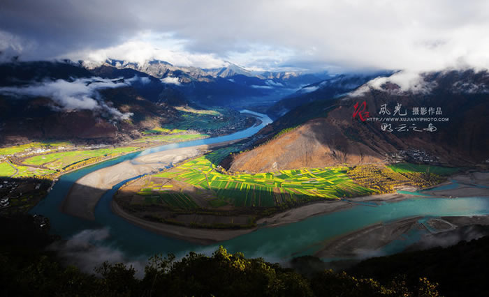 江第一湾位于云南省西北部的丽江市石鼓镇与香格里拉县南部沙松碧村之间,海拔1850米,距香格里拉县城130公里,有公路直达。万里长江从“世界屋脊”——青藏高原奔腾而下,巴塘县城境内进入云南,与澜沧江、怒江一起在横断山脉的高山深谷中穿行形成了“三江并流”的壮丽景观。到了香格里拉县的沙松碧村,突然来了个100多度的急转弯,转向东北,形成了罕见的"V"字形大弯,“江流到此成逆转,奔入中原壮大观”,人们称这天下奇观为“长江第一湾”。