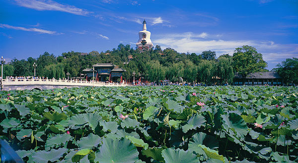 | 北海公园全园以北海为中心,面积达到0.69平方公里(其中水面约0.39平方公里)。湖口琼华岛上建的藏式白塔为全园标志。北海北岸 |